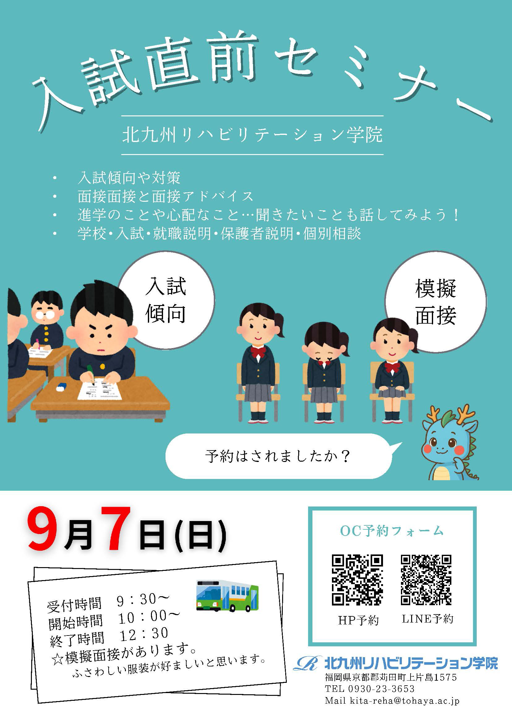 9月8日(日)のオープンキャンパスは、令和7年度入試に向けた『入試直前セミナー』を開催します。